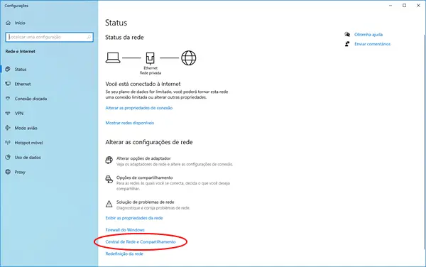 2. Na janela aberta, clique na opção “Central de Rede e Compartilhamento”.