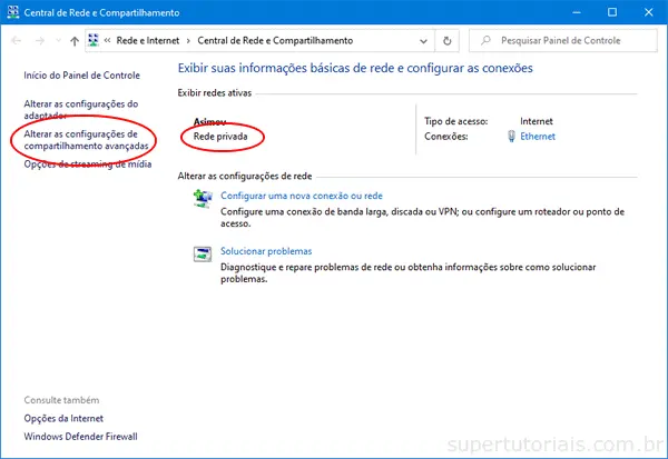 3. Anote o tipo de rede que está usando (Privada ou Pública) e, em seguida, clique na opção “Alterar configurações de compartilhamento avançadas” no menu lateral da janela de configuração de rede.
