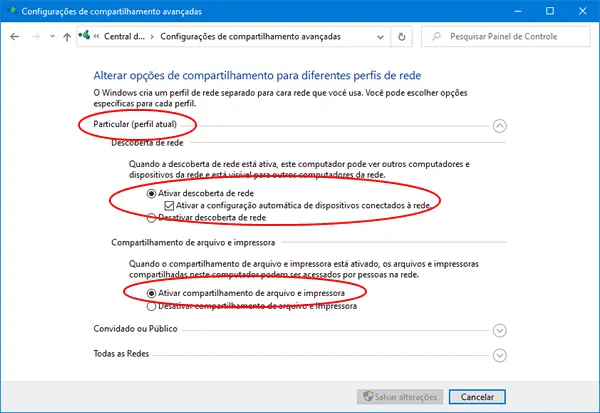 4. Clique no perfil “Particular” se sua rede for privada ou “Convidado ou Público” se ela for pública e habilite as opções: “Ativar descoberta de rede” e “Ativar compartilhamento de arquivo e impressora.”