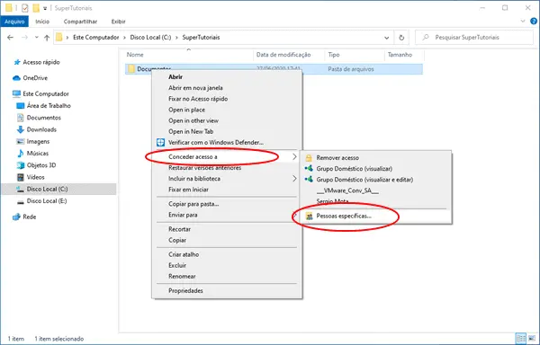 1. Para começar clique com o botão direito na pasta do computador que deseja compartilhar na rede local com outros usuários e depois selecione a opção “Conceder acesso a > Pessoas específicas…”.