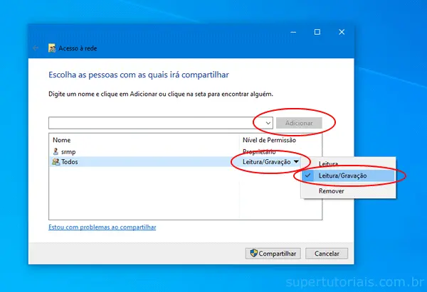 2. Selecione a opção “Todos” ou selecione um usuário específico com quem deseja compartilhar os arquivos, ajuste o nível de permissão conforme seus necessidades e clique no botão “Compartilhar”.