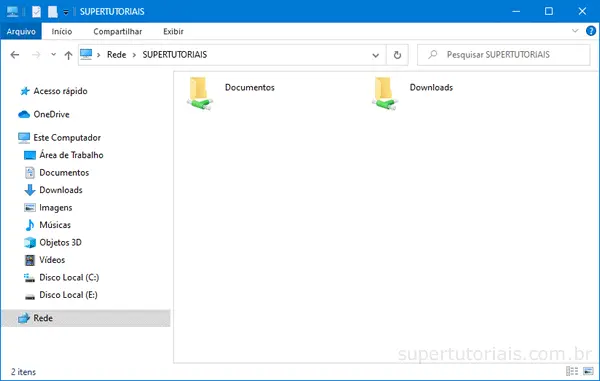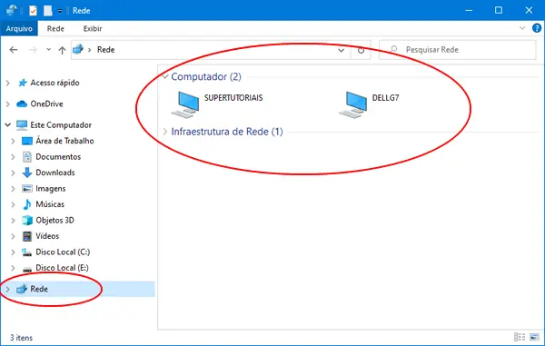 3. Pronto, agora basta você abrir o “Explorador de Arquivos” em outro computador da rede, clicar na opção “Rede” na barra lateral e você irá ver os computadores da rede local com compartilhamento.