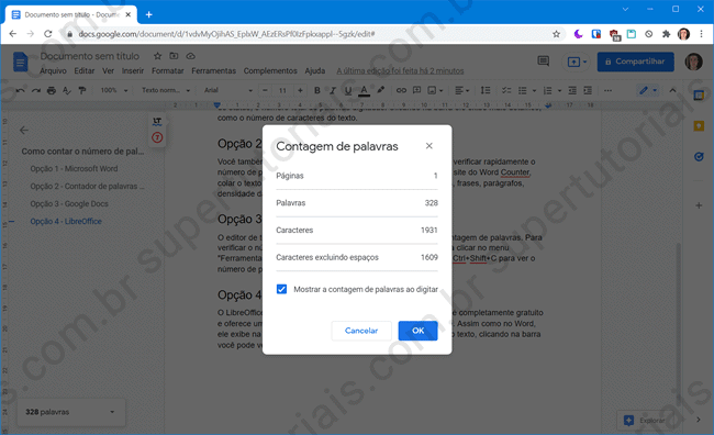O editor de texto online do Google também possui a opção de contagem de palavras. Para verificar o número de palavras de um texto no Google Docs, basta clicar no menu “Ferramentas > Contagem de Palavras” para ver as informações. Você também pode marcar a opção de exibir a contagem na tela.