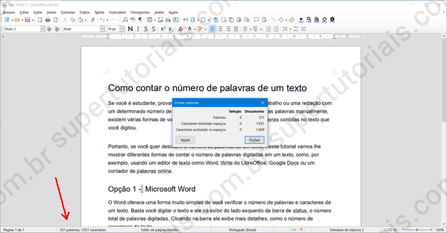 O LibreOffice é uma ótima alternativa para o Microsoft Office. Ele é completamente gratuito e oferece um editor de texto semelhante ao Word, chamado Write. Assim como no Word, ele exibe na barra de status o número de palavras e caracteres do texto, clicando na barra você pode ver mais informações.