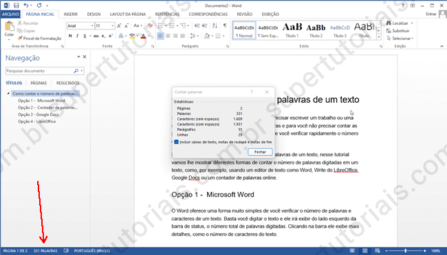 O Word oferece uma forma muito simples de você verificar o número de palavras e caracteres de um texto. Basta você digitar o texto e ele irá exibir do lado esquerdo da barra de status, o número total de palavras digitadas. Clicando na barra ele exibe mais detalhes, como o número de caracteres do texto.