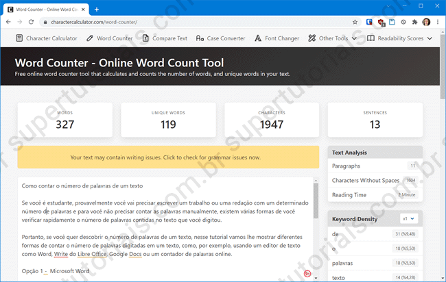 Você também pode utilizar um “contador de palavras online” para verificar rapidamente o número de palavras digitadas em um texto. Basta você acessar o site do Word Counter, colar o texto e, ele lhe mostrará o número de palavras, caracteres, frases, parágrafos, densidade das palavras, entre outros.