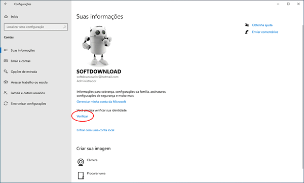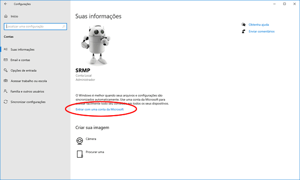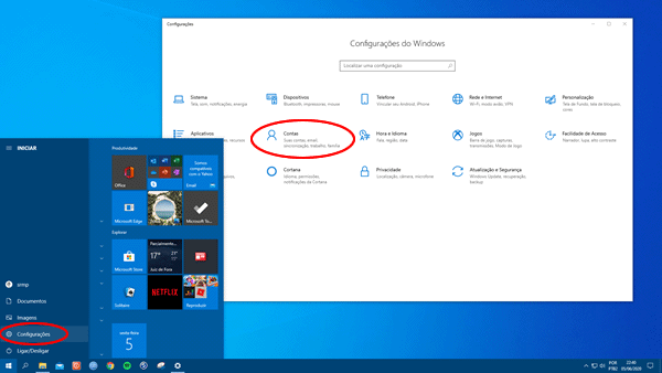 1. Abra o Menu Iniciar, clique em “Configurações > Contas” e se você ainda não estiver conectado a uma conta Microsoft nesse computador, clique em “Entrar com uma conta da Microsoft” e faça login.