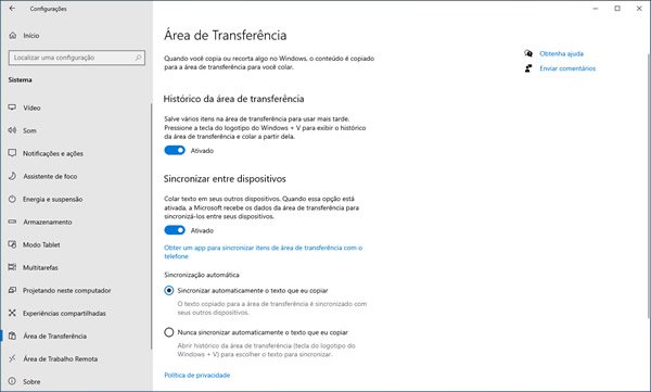 4. Ative as opções “Histórico da área de transferência” e “Sincronizar entre dispositivos”. Por padrão, ele ira sincronizar automaticamente todos os textos, entretanto você pode definir o que deseja copiar usando a tecla de atalho Windows +V que abre o histórico para você escolher o que quer sincronizar.