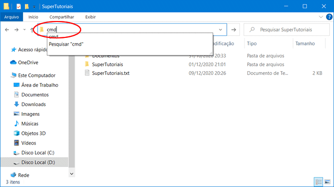 1. Abra a pasta com o arquivo que deseja transformar em super oculto, digite na barra de endereços do Windows Explorer cmd e pressione Enter para abrir o Prompt de Comando na pasta selecionada.