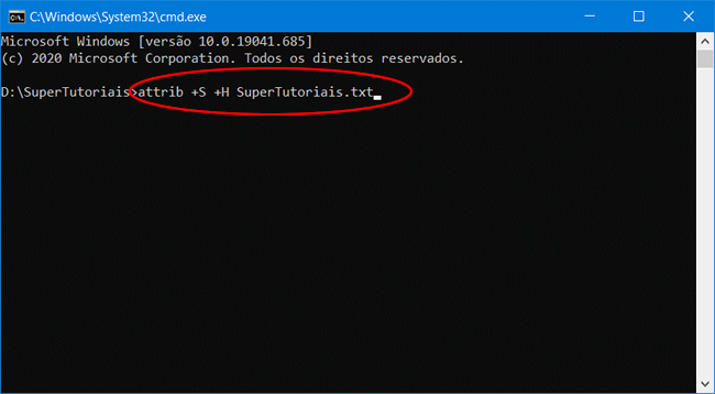 2. No Prompt de Comando, digite o comando abaixo, substituindo o nome arquivo.txt pelo nome do arquivo que deseja “super ocultar”, incluindo a extensão e pressione Enter para executar o comando.