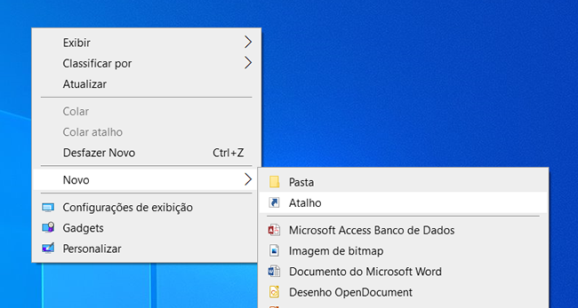 2. Em seguida, clique com o botão direito na área de trabalho e selecione “Novo > Atalho”.