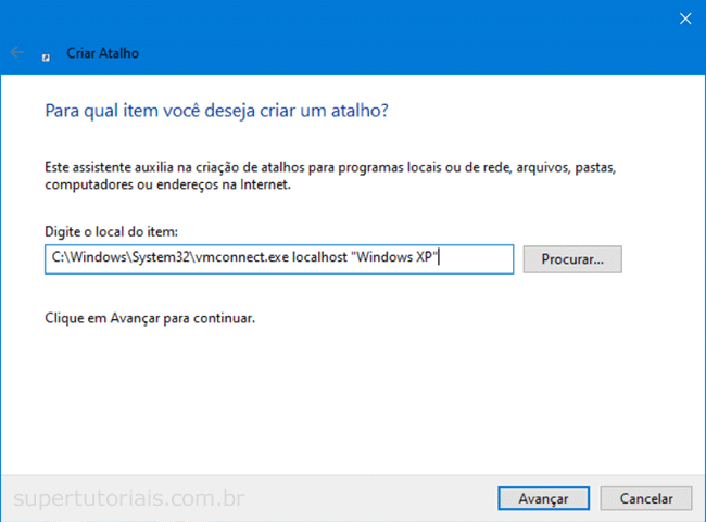 3. Insira o comando vmconnect.exe localhost “Nome da máquina entre aspas” e clique em “Avançar”.