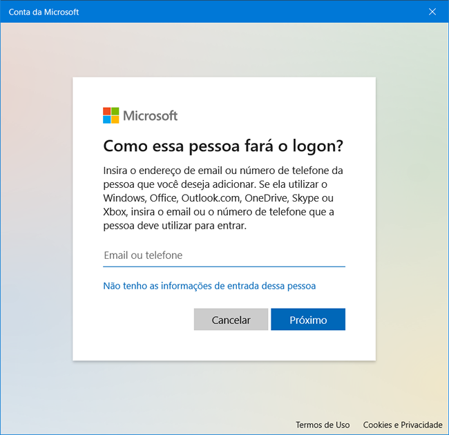 3. Informe um endereço de e-mail ou telefone para criar a conta. Por padrão, o Windows criará uma conta de usuário vinculada a uma conta da Microsoft. Opcionalmente, você pode criar uma conta de usuário local. Escrevemos um tutorial ensinando a criar uma conta de usuário local no Windows 10.