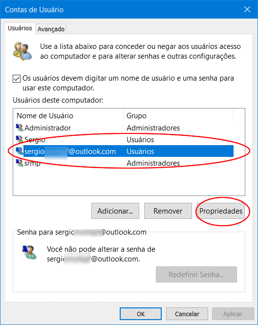 6. Selecione o usuário que deseja alterar para administrador e clique em “Propriedades”.