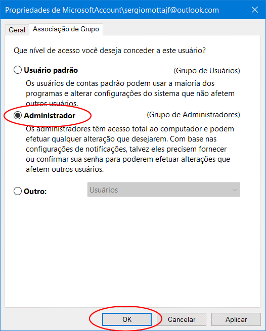 7. Clique na guia “Associação de Grupo” e troque de “Usuário padrão” para “Administrador”.