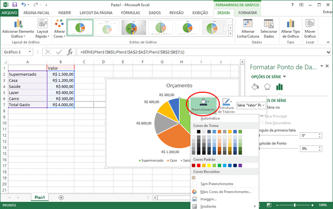 10. Se você quiser trocar a cor de uma fatia específica, clique no gráfico, em seguida dê dois cliques sobre a fatia que deseja alterar, clique com o botão direito e selecione uma cor em “Preenchimento”.