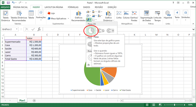 3. Selecione a pizza em “Pizza 2D” e o Excel irá gerar um gráfico de pizza dentro de sua planilha.