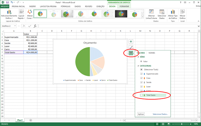 5. Em seguida você pode querer que alguns valores não sejam exibidos no gráfico. Por exemplo, no gráfico abaixo não queremos exibir o valor total no gráfico. Clique dentro do gráfico e depois no filtro do gráfico do lado direito desmarque o valor que não deseja mostrar no gráfico e clique em “Aplicar”.