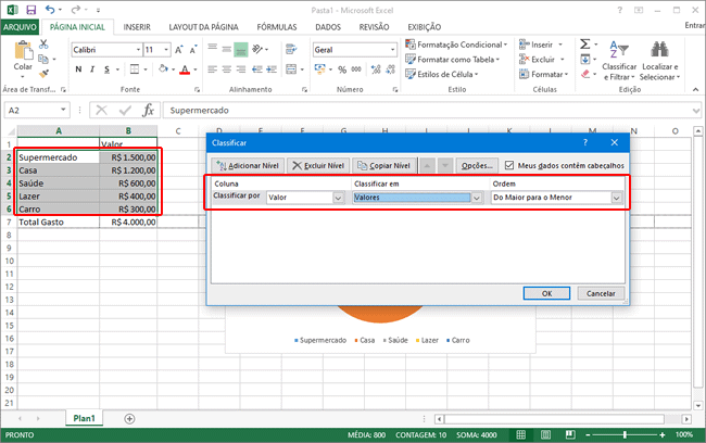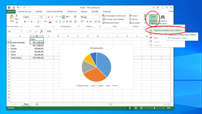 6. Você também pode ordenar os valores no gráfico para que as fatias sejam exibidas da maior para a menor. Abra a guia “Página inicial”, clique com o cursor do mouse em uma célula preenchida com valor, clique na opção “Classificar e Filtrar” e selecione a opção “Classificar do Maior para o Menor”.