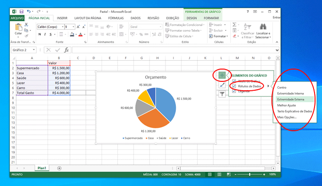 8. Para exibir os valores no gráfico, clique dentro do gráfico, depois no botão (+) e marque a opção “Rótulos de Dados”. Por fim, você pode definir aonde os valores (rótulos) serão exibidos no gráfico. Para escolher os dados exibidos no rótulo, clique em “Mais opções…” e defina o conteúdo do rótulo.