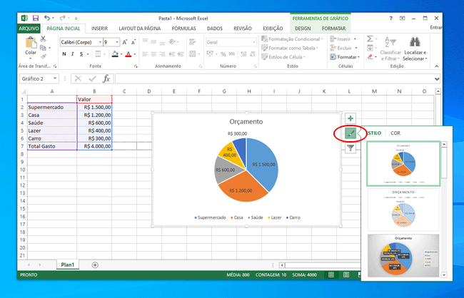 9. Por fim, para ajustar as cores do gráfico, clique no ícone de pincel e você verá as guias “Estilo e Cores”. Explore as opções em ambas as guias e escolha um esquema de cores de sua preferência.