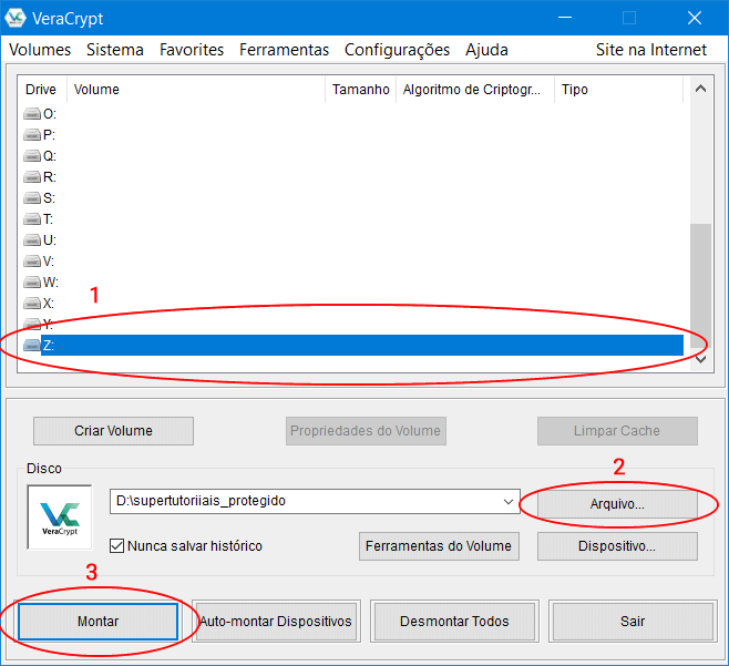 1. Para acessar a pasta criptografada, abra o VeraCrypt, selecione uma letra de unidade, clique em “Arquivo” e selecione o arquivo (recipiente), que você criou no passo “5” e clique no botão “Montar”.