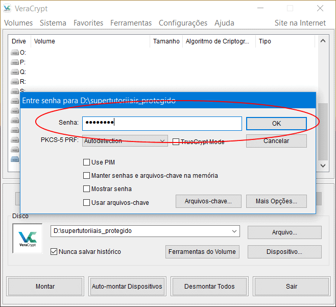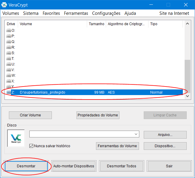 4. Quando terminar de usar a pasta, abra o VeraCrypt, selecione a mesma letra de unidade e clique em “Desmontar” para bloquear a pasta. Uma vez bloqueada, será necessário informar a senha para abrir a pasta novamente. Note que a pasta também é bloqueada se o PC for desligado ou reiniciado.