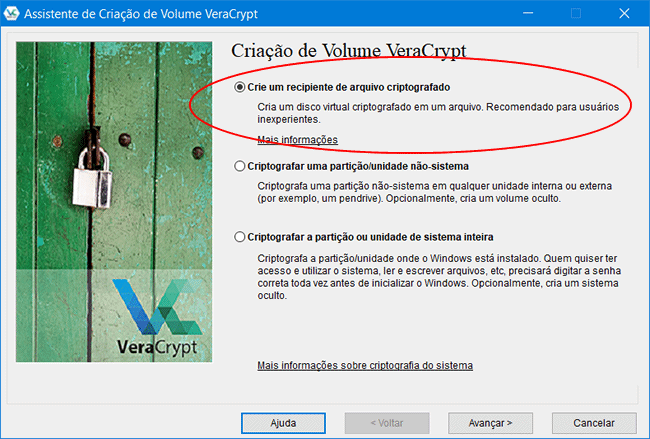 3. Selecione a opção “Crie um recipiente de arquivo criptografado” e clique em “Avançar”.