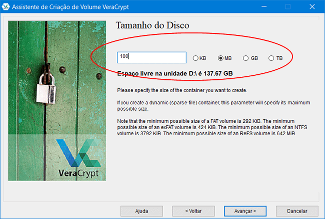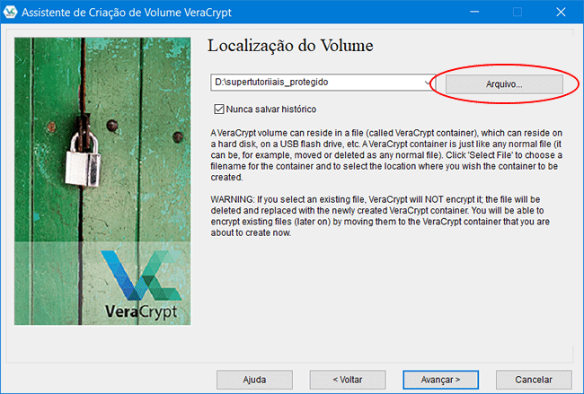 5. Em seguida, clique no botão “Arquivo” e selecione o local aonde deseja colocar o volume (pasta) criptografado e protegido por senha. Você precisa digitar um nome para salvar o arquivo (recipiente).