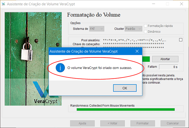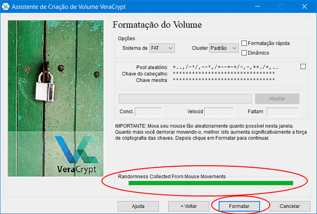 9. Uma vez feito isso, ele irá criar o recipiente. Movimente o mouse aleatoriamente pela janela para aumentar a força da criptografia. Quando a barra de progresso chegar ao fim, clique em “Formatar”.
