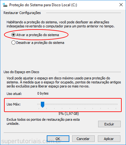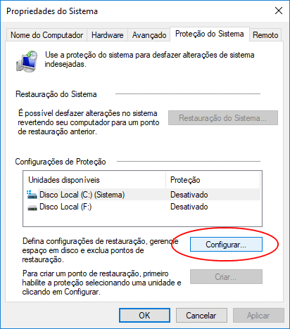 2. A primeira coisa que você irá precisar fazer é habilitar o recurso de “restauração do sistema”, que por padrão está desativada no Windows 10. Clique no botão “Configurar” e sigas s próximas etapas.