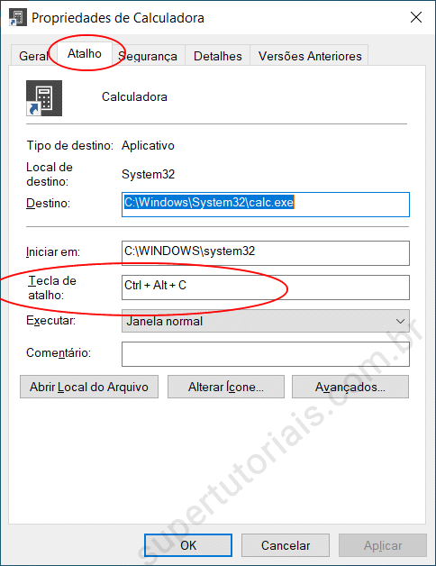 5. Na guia “Atalho“, defina no campo “Tecla de Atalho“, a combinação de teclas que deseja utilizar para abrir a calculadora. Por exemplo, “Ctrl+Alt+C” ou qualquer outra combinação que você quiser.