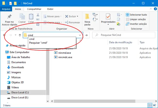 2. Em seguida, abra a pasta no Windows Explorer e digite CMD na barra de endereços para abrir o Prompt de Comando diretamente na pasta “NirCmd” para você executar os comandos necessários.