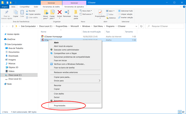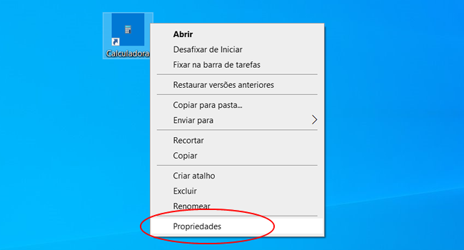 2. Clique com o botão direito no atalho do programa e selecione a opção “Propriedades”.