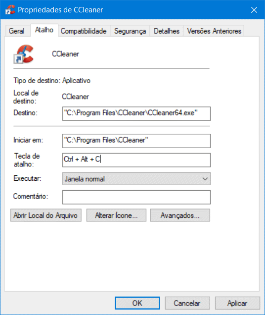 3. Na guia “Atalho”, localize o campo “Tecla de atalho” e configure a tecla de atalho que deseja usar para abrir o programa. Você deve usar a combinação “Ctrl+Alt” ou “Ctrl+Shift” ou “Alt+Shift” + Letra.