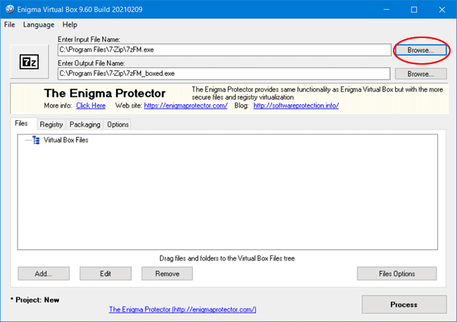 3. Uma vez instalado, execute o Engima Virtual Box, clique no botão “Browse” da opção “Enter Input File Name” e selecione o arquivo executável (.EXE) do programa que deseja transformar em portátil.