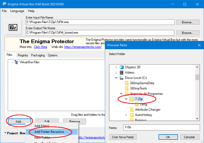 4. Agora precisamos adicionar os outros arquivos da pasta do programa para que ele funcione como “portátil”. Clique no botão “Add > Add Folder Recursive” e selecione a “pasta principal” do programa.