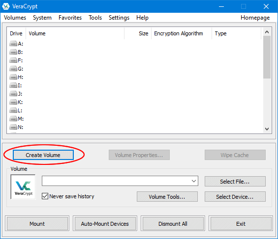 1. Abra o programa VeraCrypt e clique no botão “Create Volume”.