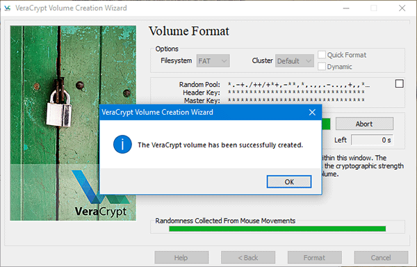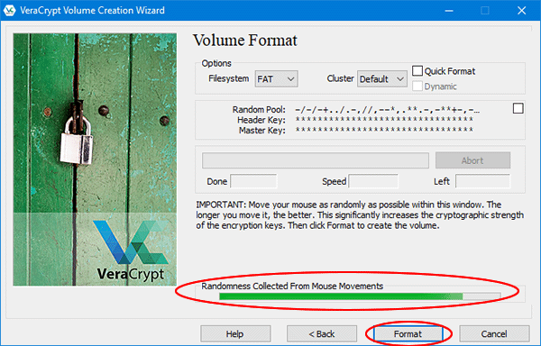 10. Agora você deve mover o mouse aleatoriamente sobre a janela do VeraCrypt. Esse processo irá tornar a criptografia mais forte. Quando a barra de progresso chegar ao fim clique no botão “Format”.