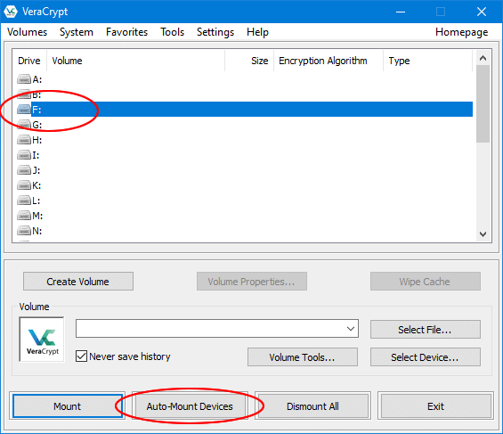 1. Abra o VeraCrypt, selecione uma letra de unidade e clique em “Auto-Mount Devices”. Se preferir, você pode escolher a letra, clicar em “Select Device”, escolher o pendrive e clicar no botão “Mount”.