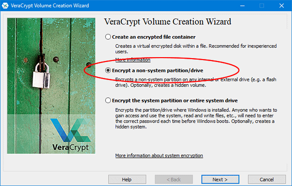 2. Selecione a segunda opção “Encrypt a non-system partition-drive” e clique em “Next”.