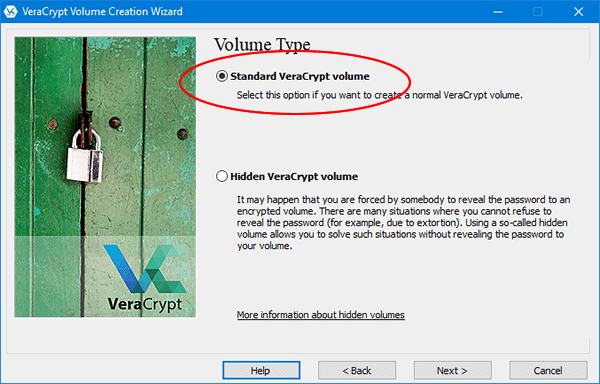 3. Marque a opção “Standard VeraCrypt volume” e clique em “Next”.