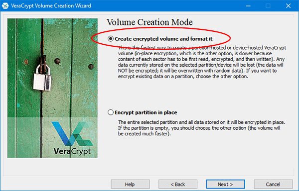 5. Selecione a opção “Create encrypted volume and format it” e clique em “Next.