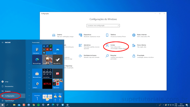 1. Clique em “Configurações” no Menu Iniciar e selecione a opção “Contas”.
