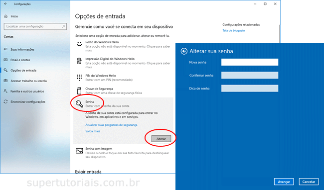 3. Para que a tela de bloqueio não seja exibida na inicialização do Windows 10 você pode desabilitar sua senha. Clique em “Senha>Alterar”, digite sua senha atual, deixe tudo em branco e clique em OK.