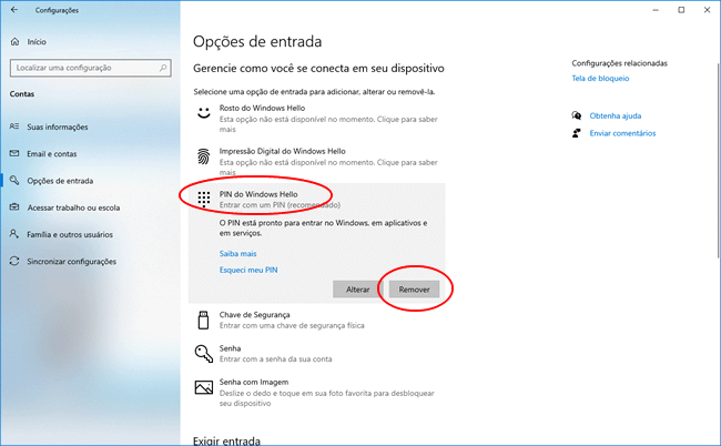 4. Se você configurou um PIN, você também precisará removê-lo. Clique na opção “Pin do Windows Hello” e clique no botão “Remover” para excluir o PIN e impedir que ele seja exigido na inicialização.
