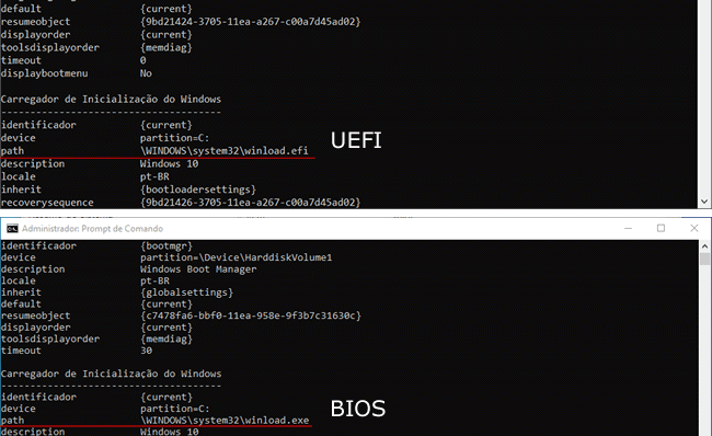 2. Em seguida, digite o comando bcdedit e pressione “Enter”. Localize a linha “path” e se ela estiver exibindo o caminho para o arquivo winload.efi, ela é UEFI, porém se for winload.exe é BIOS Legacy.