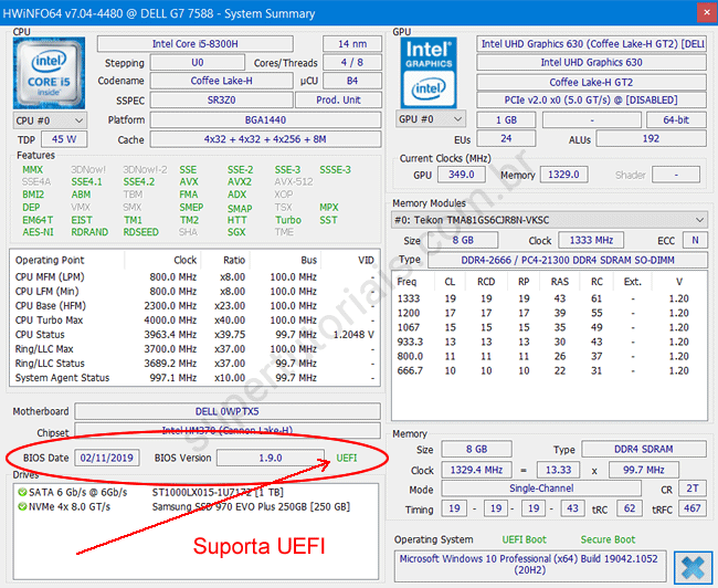 No HWINFO exibe se o PC é compatível com UEFI e no msinfo32, exibe se você está usando atualmente BIOS ou UEFI.