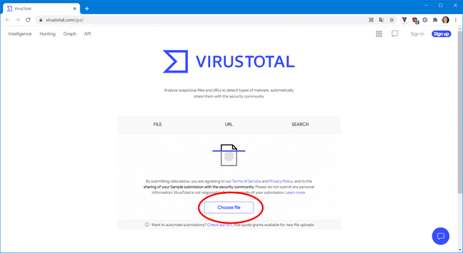 1. Abra o site do VirusTotal, clique em “Choose File” e selecione o arquivo que deseja examinar.