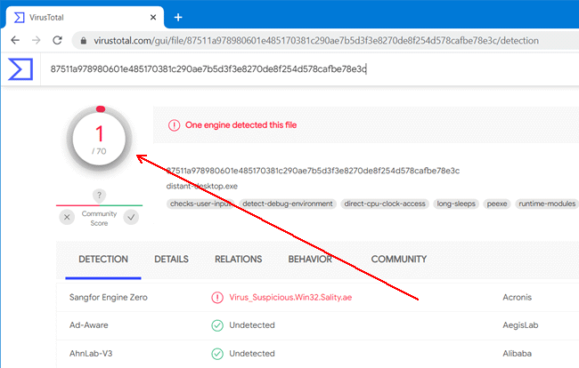 3. Em seguida ele exibe o resultado da análise. Na maioria dos casos, quando um ou dois antivírus, detectam o arquivo como ameaça, ele é seguro para usar. Esses antivírus o definem como ameaça por ele ser desconhecido. Portanto, se trata de um “falso positivo”, uma detecção falsa do antivírus.